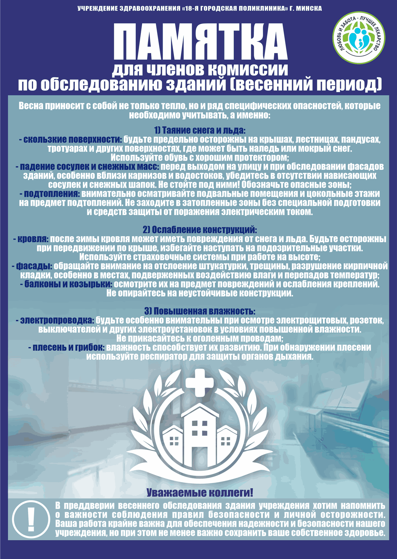 В период с 23 по 27 марта 2026 года в учреждении здравоохранения «18-я городская поликлиника» проходит Неделя нулевого травматизма (далее - ННТ) по теме: «Обеспечение безопасности труда при проведении весеннего осмотра зданий и сооружений».